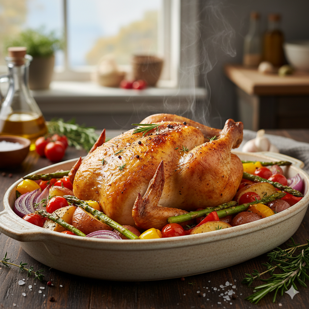 - Coloca pollo y verduras en bandeja, aliña con aceite, sal y pimienta.